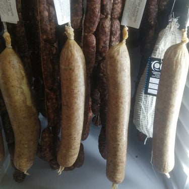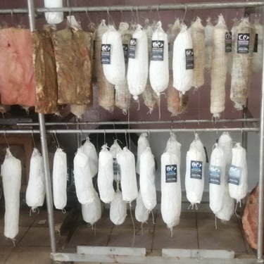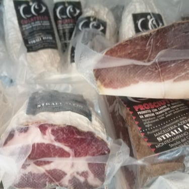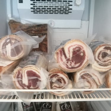 Da noi troverete carne da cuocere o carne da noi trasformata in prelibati salumi. Oltre ai classici insaccati come prosciutto, lonza, pancetta, guanciale, spalletta, salame di vario tipo, coppa e ciauscolo , produciamo salumi "leggeri" come il "piccione" che potremmo assimilare al "culatello" per la sua magrezza. Inoltre ultimamente produciamo il salame di prosciutto anche esso più leggero per l'utilizzo delle parti magre del maiale.